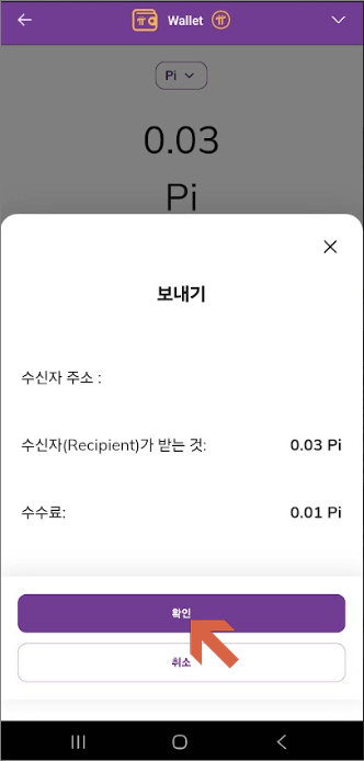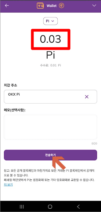 11. 보낼 Pi 수량 입력 (수수료 포함) 확인